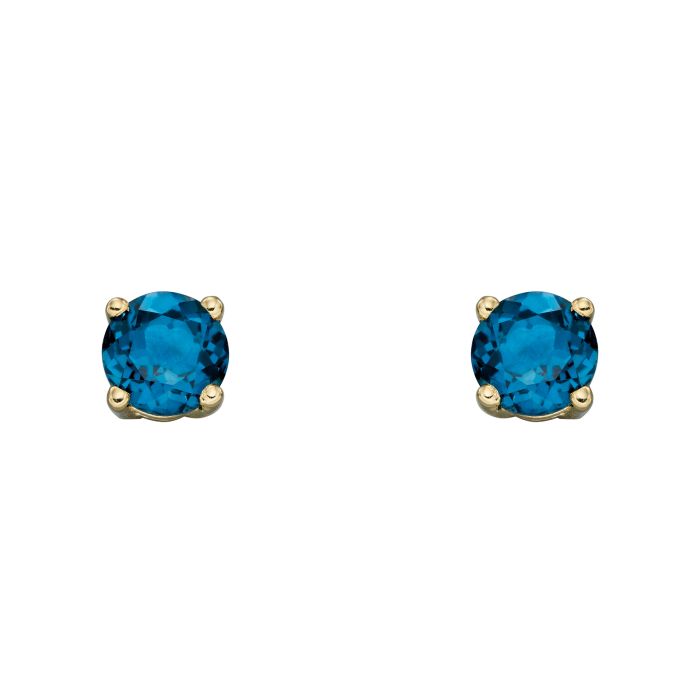 Simple, faceted London blue topaz gemstones in 9ct yellow gold claw setting and post. (4mm diameter)